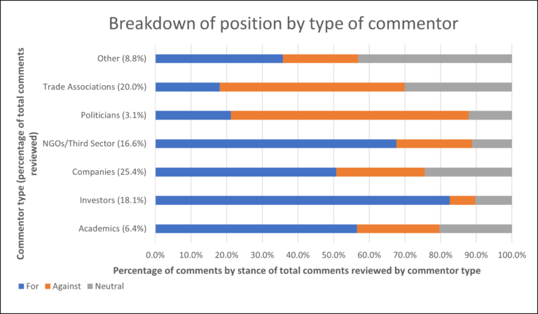 In June, the comment period closed on the SEC’s proposed rulemaking on “The Enhancement and Standardization of Climate-Related Financial Disclosures” (the Proposal). The SEC received more than 5,000 comments on the Proposal. The Commonwealth Climate and Law Initiative has conducted a review and analysis of the more than 1,000 comments made by trade associations, politicians, NGO and third sector entities, companies, investors and academics, as well as lawyers, professional organisations, regulators and standards bodies (these latter four groups are categorised as Other in the chart below as the absolute numbers are relatively small). Form letter comments and comments made by individuals were excluded from the review on the basis that the review focused on certain arguments which were not commonly addressed in such comments.